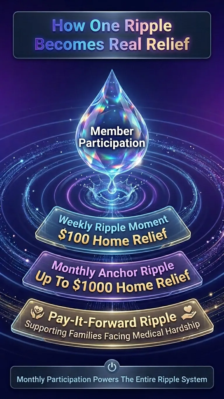 Each month, one participating member receives $1,000 in verified home relief — while $100 Ripple Moments move through the community weekly. The Ripplabs platform is built on participation - not luck.